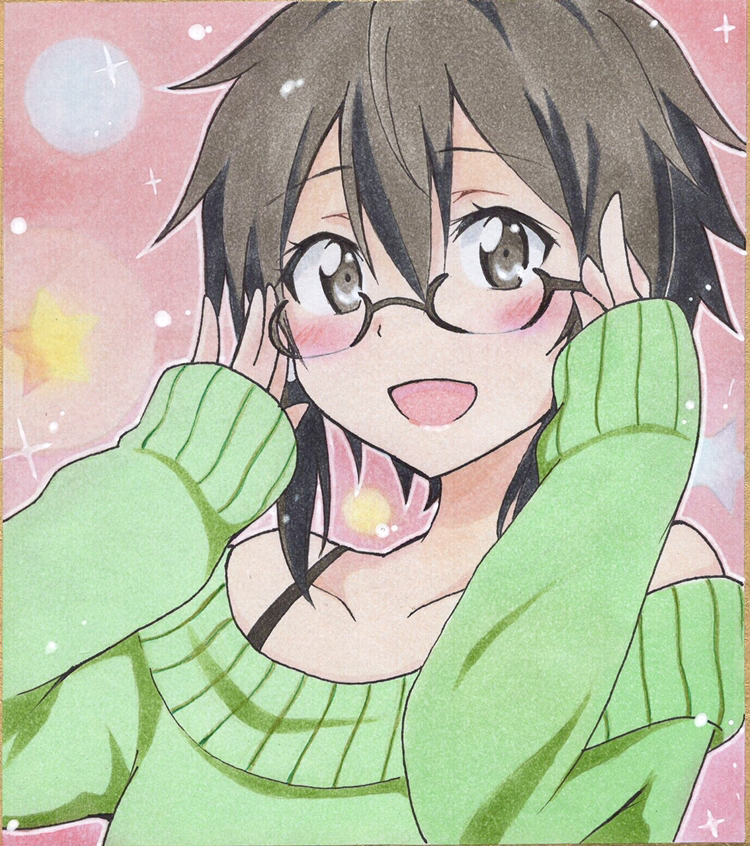 1girl adjusting_eyewear asada_shino black_eyes black_hair blush collarbone eyelashes female_focus glasses green_sweater hands_up happy long_sleeves looking_at_viewer marker_(medium) off-shoulder_sweater off_shoulder open_mouth photo_(medium) semi-rimless_eyewear short_hair sidelocks sleeves_past_wrists smile solo sparkle star_(symbol) sweater sword_art_online tina1213 traditional_media upper_body