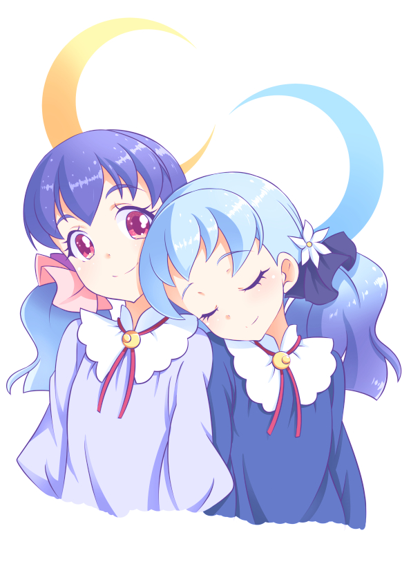 2girls aged_down aikatsu!_(series) aikatsu_friends! blue_hair bow commentary_request flower gradient_hair hair_flower hair_ornament long_hair multicolored_hair multiple_girls shirayuri_kagura shirayuri_sakuya shiruppo siblings sisters twins twintails