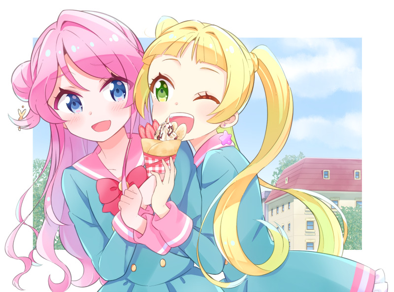 2girls :d ;d aikatsu!_(series) aikatsu_friends! bad_id bad_tumblr_id blonde_hair blue_dress blue_eyes blunt_bangs blush bow bowtie building buttons check_(check_book) chono_maika clenched_hand commentary_request day double-breasted dress earrings food green_eyes hair_bun hair_intakes hinata_ema_(aikatsu_friends!) holding holding_food jewelry long_hair long_sleeves looking_at_another multiple_girls one_eye_closed open_mouth outdoors parfait pink_hair pink_sailor_collar red_neckwear sailor_collar sailor_dress school_uniform serafuku shared_food side_bun single_side_bun smile star_(symbol) star_earrings twintails