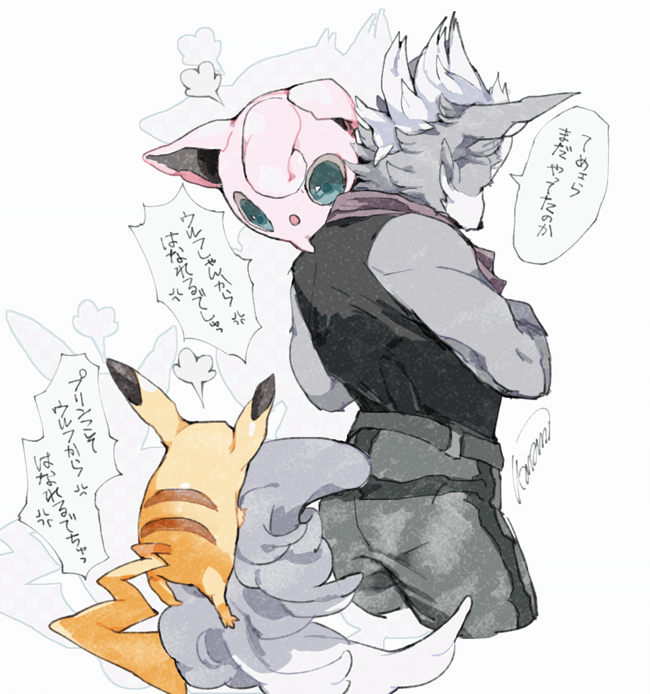 1boy animal animal_ears animal_on_shoulder aqua_eyes artist_name ass bad_id bad_twitter_id bare_shoulders belt black_shirt cowboy_shot cropped_legs drop_shadow from_behind full_body furry furry_male gen_1_pokemon grey_background grey_pants japanese_text jigglypuff kanami33 male_focus nintendo on_shoulder open_mouth pants pikachu pokemon pokemon_(creature) pokemon_on_shoulder purple_neckwear shirt signature simple_background sleeveless sleeveless_shirt speech_bubble standing star_fox super_smash_bros. tail talking text_focus translation_request wolf_ears wolf_o'donnell wolf_tail