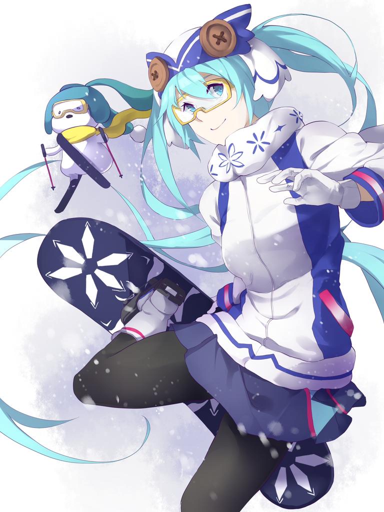 1girl aqua_hair bad_id bad_twitter_id black_pantyhose blue_eyes blue_hair boots buttons closed_mouth commentary earmuffs english_commentary gloves goggles hatsune_miku headgear long_hair long_sleeves looking_at_viewer lynus mittens pantyhose rabbit scarf skirt smile snow snowboard twintails very_long_hair vocaloid white_gloves yuki_miku