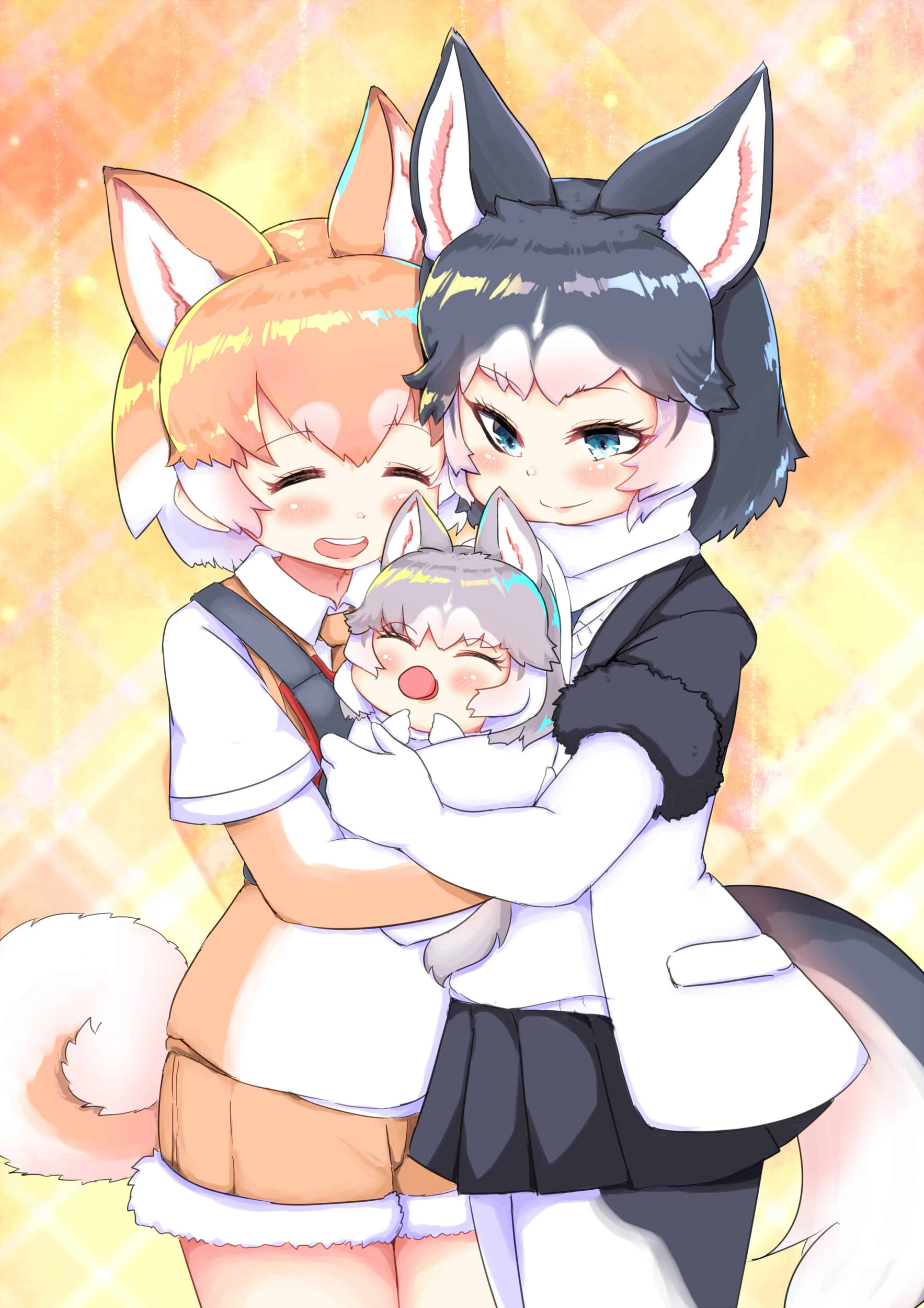 3girls absurdres aged_down animal_ear_fluff animal_ears baby black_hair blue_eyes blush carrying carrying_baby carrying_person child closed_eyes collared_shirt commentary_request cowboy_shot dog_(mixed_breed)_(kemono_friends) dog_(shiba_inu)_(kemono_friends) dog_ears dog_tail elbow_gloves extra_ears fur_trim gloves grey_hair harness highres hug if_they_mated kemono_friends light_brown_hair mother_and_child mother_and_daughter multicolored_hair multiple_girls necktie open_mouth pantyhose parent_and_child pleated_skirt scarf shimanoji shirt short_hair short_shorts short_sleeves shorts siberian_husky_(kemono_friends) skirt smile sweater tail white_hair