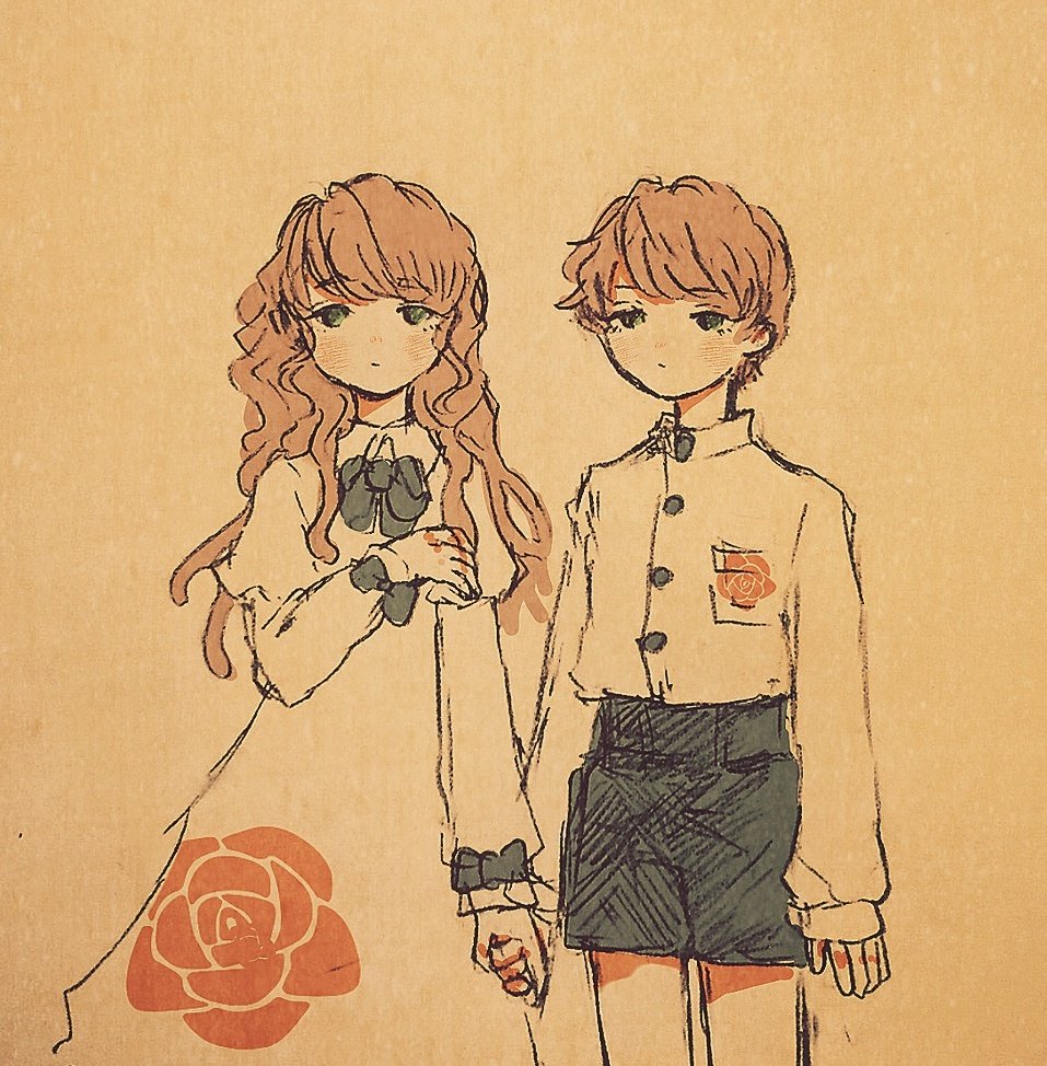 2girls androgynous bow brown_hair cowboy_shot dress expressionless feet_out_of_frame flower green_bow green_eyes holding_hands juliet_sleeves long_hair long_sleeves looking_at_viewer multiple_girls original pocket puffy_sleeves red_flower sakura_szm shirt short_hair shorts siblings sisters white_dress white_shirt