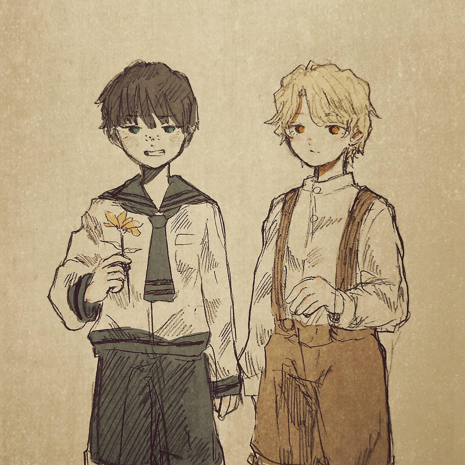 2boys bad_id bad_twitter_id black_hair blonde_hair feet_out_of_frame flower freckles green_eyes green_neckerchief green_sailor_collar hand_up highres holding holding_flower long_sleeves looking_at_viewer male_focus multiple_boys neckerchief orange_eyes orange_pants original pants parted_lips sailor_collar sakura_szm shirt short_hair suspenders white_shirt yellow_flower