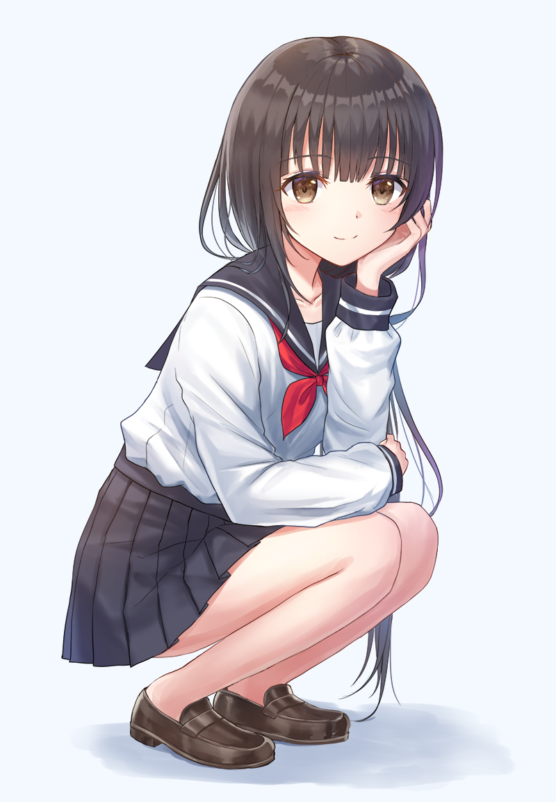 1girl black_sailor_collar black_skirt blouse blue_background blush brown_eyes brown_hair brown_shoes closed_mouth collarbone commentary_request female_focus from_side full_body hand_up loafers long_hair long_sleeves neckerchief original pleated_skirt red_neckerchief sailor_collar school_uniform serafuku seungju_lee shadow shirt shoes skirt smile solo squatting very_long_hair white_shirt
