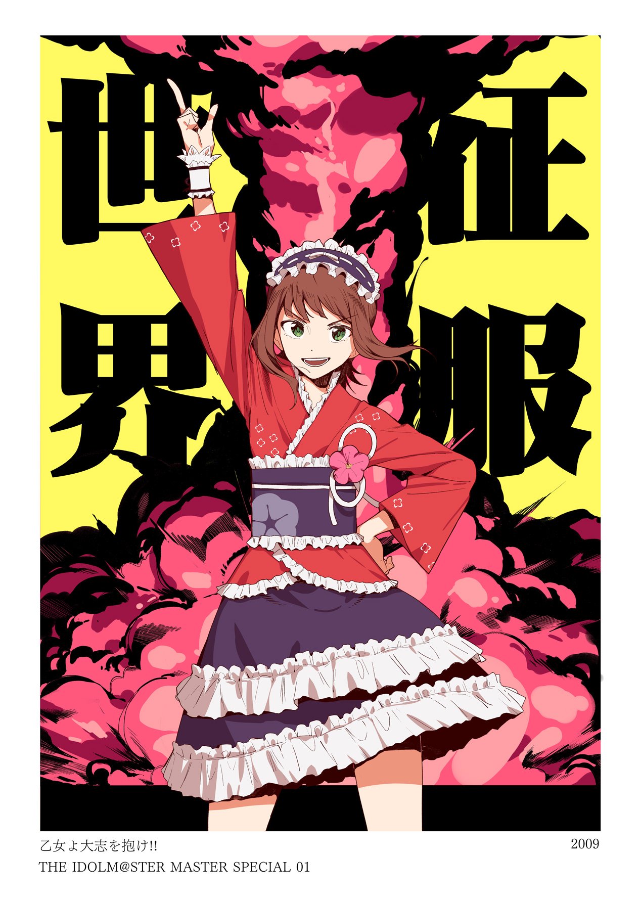 1girl amami_haruka border brown_hair commentary cowboy_shot explosion female_focus floral_print flower frilled_hairband frilled_kimono frills green_eyes hairband highres idolmaster idolmaster_(classic) index_finger_raised japanese_clothes kimono kimono_skirt lolita_fashion long_sleeves looking_at_viewer nakamura_rohane obi open_mouth pointing pointing_up sash short_hair smile solo song_name translation_request v-shaped_eyebrows wa_lolita white_border wrist_cuffs