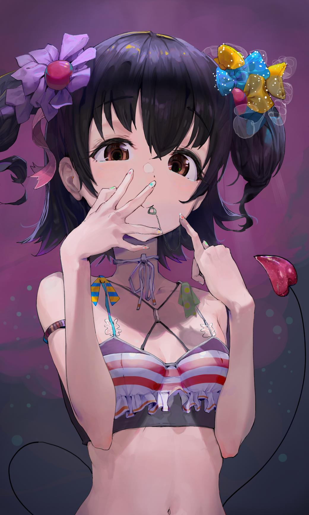 1girl akagi_miria armlet black_hair bow breasts brown_eyes choker cleavage collarbone commentary crop_top demon_tail female_focus frills hair_bow hair_ornament hair_ribbon heart heart_tail highres idolmaster idolmaster_cinderella_girls jewelry looking_at_viewer mouth_hold multicolored_nails nail_polish navel rawtuna ribbon ribbon_choker short_hair small_breasts smile solo spaghetti_strap striped tail two_side_up upper_body