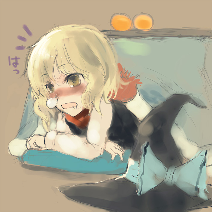 1girl blonde_hair blush bow crossed_arms drooling female_focus hands_up hat japanese_text kirisame_marisa kotatsu long_sleeves nokishita nose_bubble open_mouth scarf short_hair sick simple_background snot solo sound_effects table touhou translated witch witch_hat yellow_eyes
