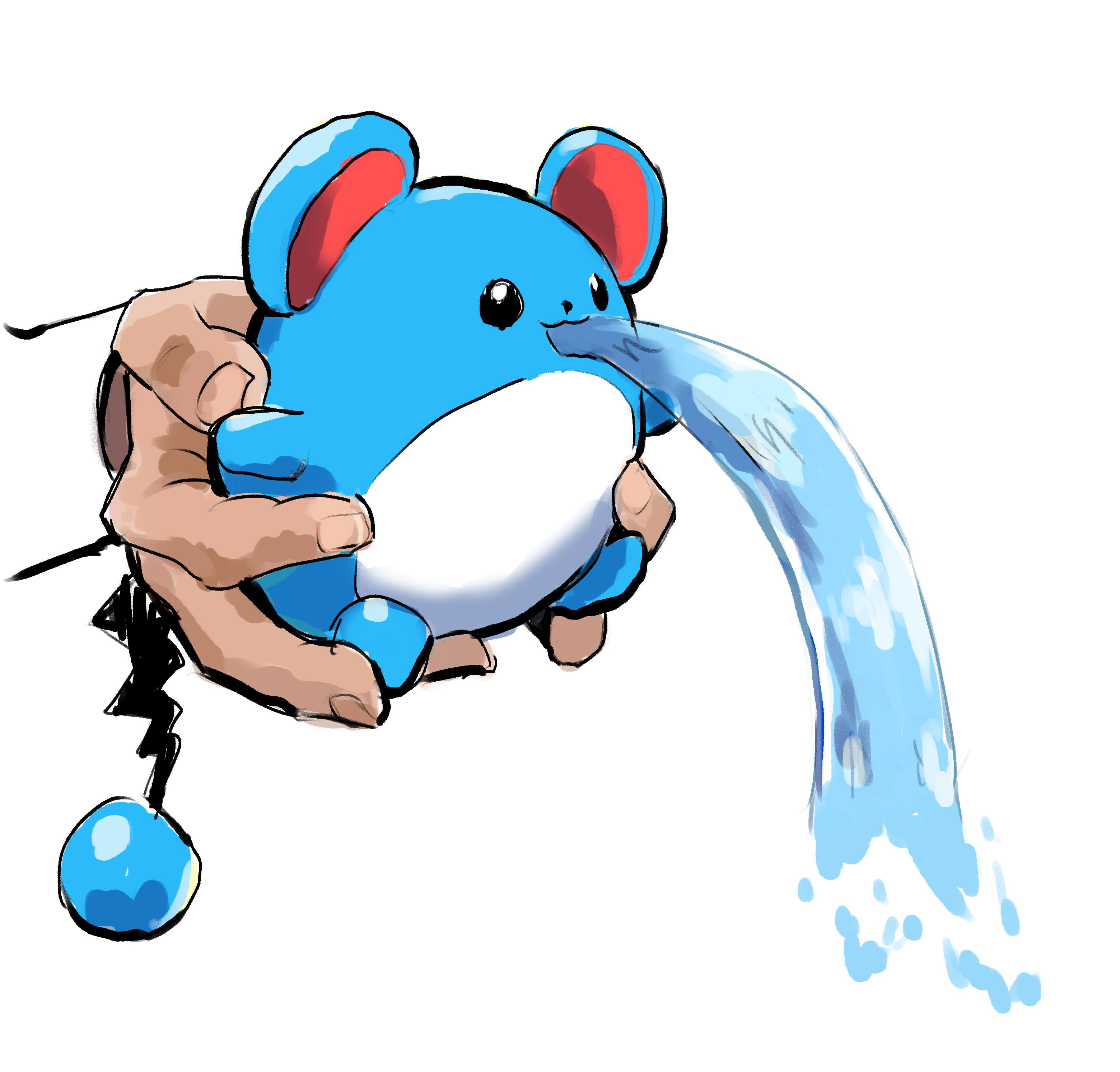 :3 absurdres bad_id bad_twitter_id black_eyes disembodied_hand fish_spitting_water full_body gen_2_pokemon happy held_up highres jpeg_artifacts labotamochi long_sleeves marill meme nintendo open_mouth pokemon pokemon_(creature) puffer_fish_vomiting_water_(meme) simple_background sketch smile solo_focus squirting_liquid water white_background