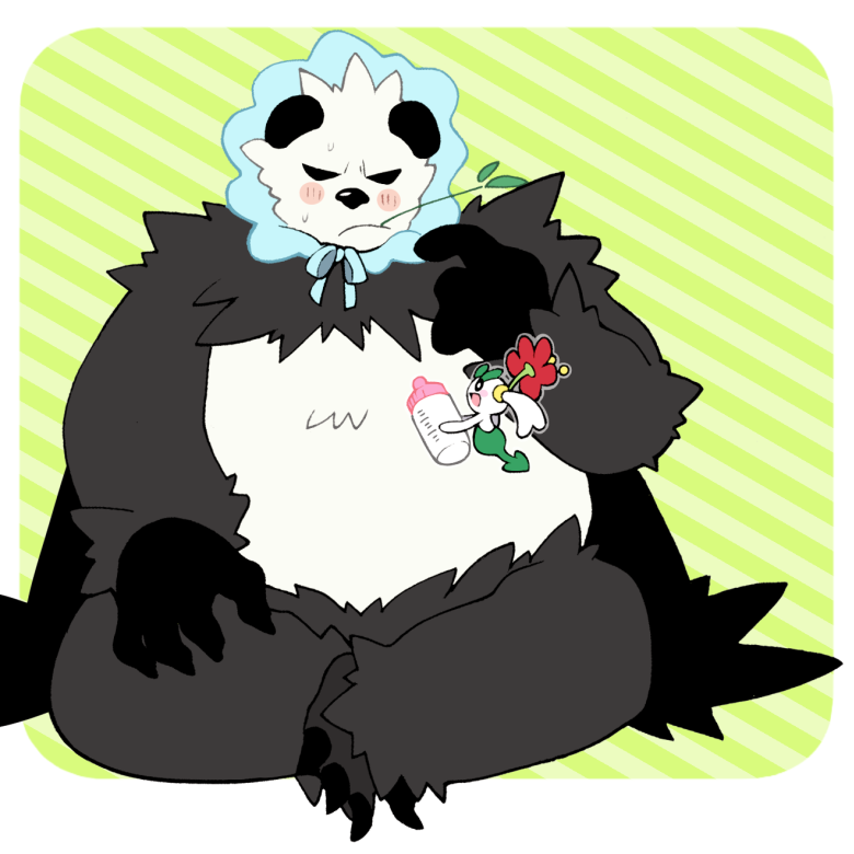 baby_bottle black_cape black_eyes blush blush_stickers bonnet border bottle cape claws closed_mouth flabebe flabebe_(red_flower) floating flower full_body furry gen_6_pokemon green_background grey_outline hand_up hands_up happy holding indian_style looking_at_another looking_up minashirazu mouth_hold nintendo open_mouth outline pangoro pokemon pokemon_(creature) red_flower simple_background sitting size_difference smile striped_background sweat twig white_border