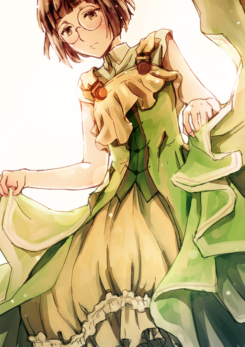 1girl brown_eyes brown_hair curtsey dress dutch_angle erica_brown feet_out_of_frame female_focus glasses green_dress holding_own_dress ren_mizuha serious short_hair short_sleeves simple_background solo standing violet_evergarden_(series) white_background