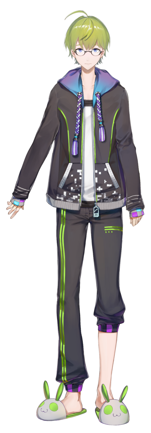 1boy ahoge animal_slippers black_jacket black_pants blue_eyes bunny_slippers closed_mouth full_body glasses green_hair highres hoojiro jacket long_sleeves looking_at_viewer male_focus nijisanji official_art pants pants_rolled_up shibuya_hajime shirt sleeves_past_wrists slippers solo standing straight-on tachi-e transparent_background virtual_youtuber white_shirt zipper zipper_pull_tab