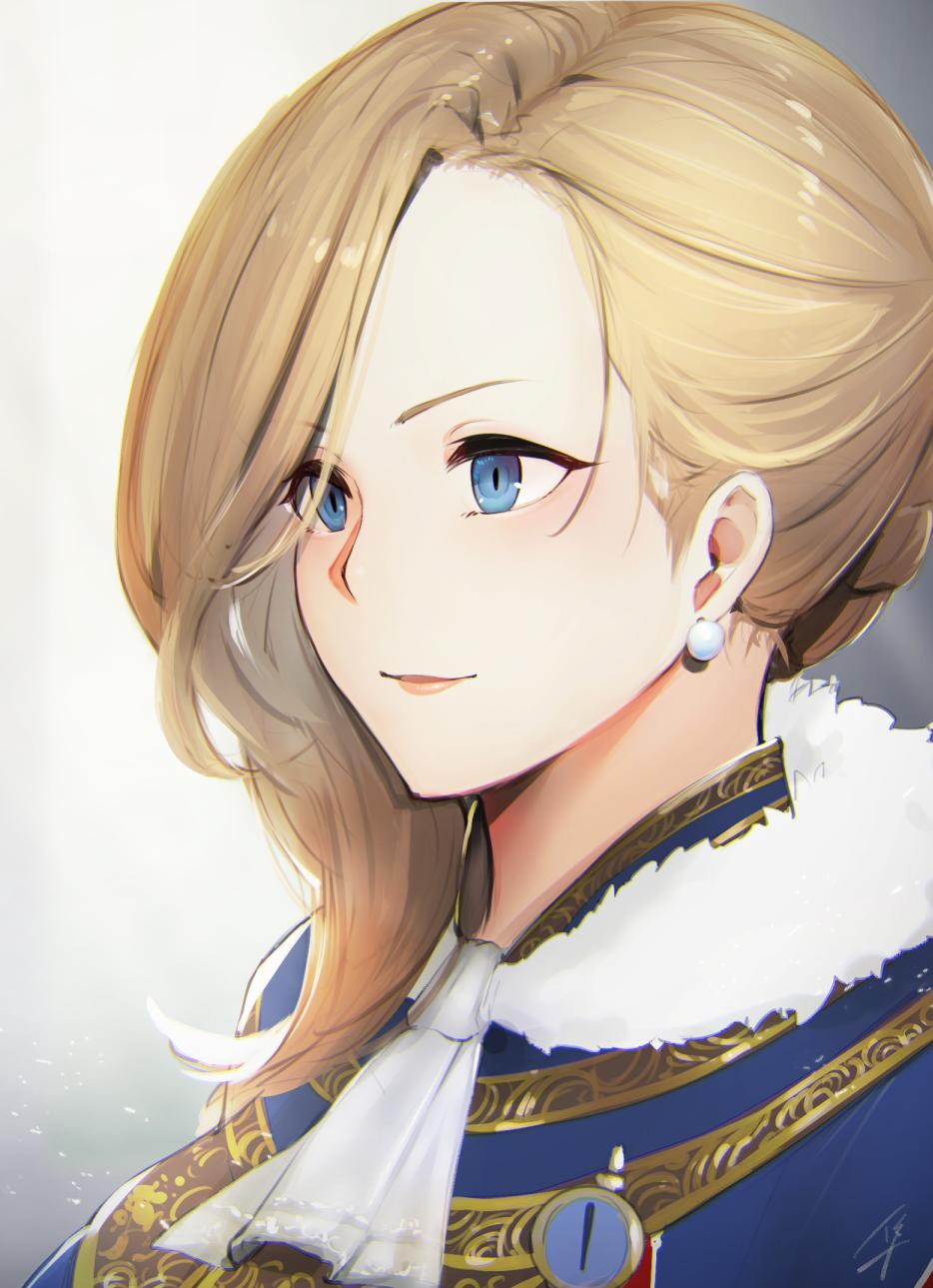 1girl azur_lane blonde_hair blue_eyes closed_mouth commentary_request earrings female_focus hair_over_shoulder hayabusa_(vert_320) highres hood_(azur_lane) jewelry light_smile long_hair looking_afar portrait simple_background solo