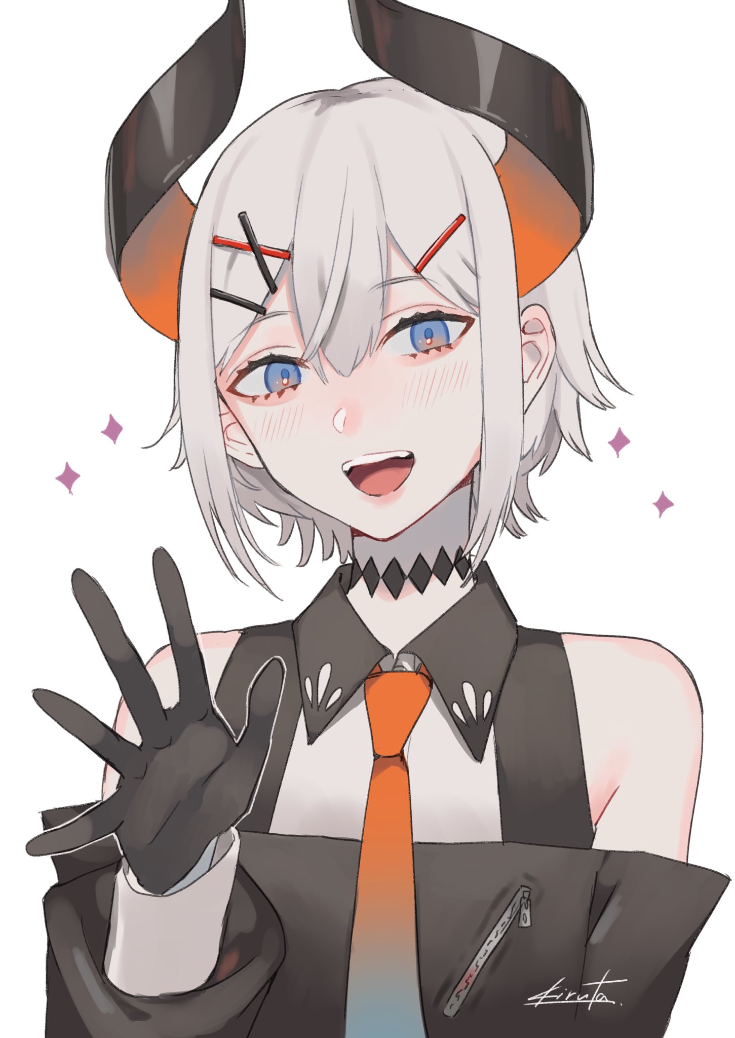 1girl bare_shoulders black_coat black_gloves blue_eyes blue_neckwear blush coat demon_girl demon_horns gloves gradient_necktie gradient_neckwear hair_between_eyes hair_ornament hairclip highres horns kirudai levi_elipha long_sleeves necktie nijisanji nose_blush open_mouth orange_neckwear shirt sleeveless sleeveless_shirt smile sparkle upper_body virtual_youtuber waving white_background white_hair