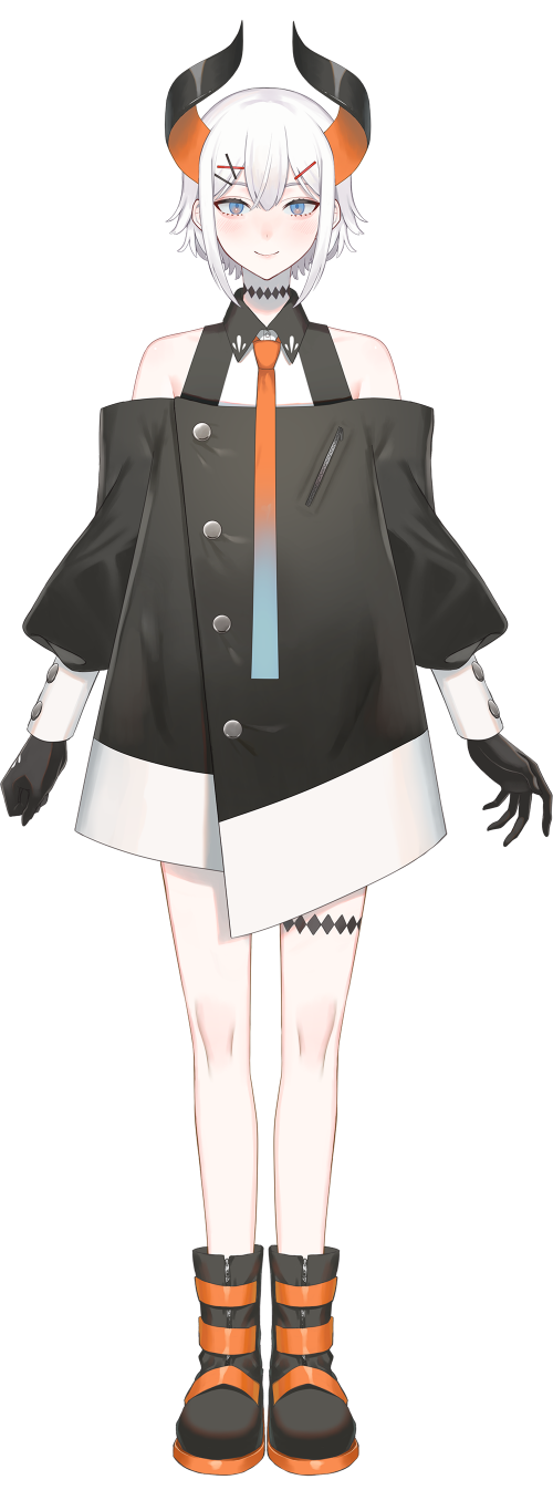 1girl bare_shoulders black_coat black_footwear black_gloves blue_eyes blue_neckwear blush boots closed_mouth coat demon_girl demon_horns full_body gloves gradient_necktie gradient_neckwear hair_between_eyes hair_ornament hairclip highres horns kirudai levi_elipha long_sleeves markings necktie nijisanji nose_blush official_art orange_neckwear short_hair sleeveless smile standing straight-on tachi-e transparent_background virtual_youtuber white_hair