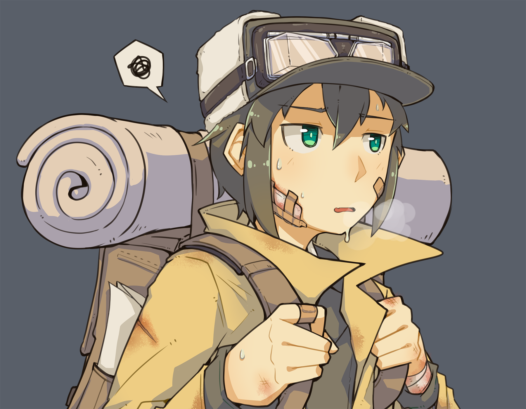 1girl androgynous backpack bag bandaged_head bandages bandaid bandaid_on_face bandaid_on_hand breath coat female_focus goggles goggles_on_headwear green_eyes grey_background hair_between_eyes hat high_collar highres injury kino_(kino_no_tabi) kino_no_tabi kokuya_(kokuya28) long_sleeves looking_away open_clothes open_coat parted_lips reverse_trap short_hair simple_background solo speech_bubble tomboy upper_body yellow_coat