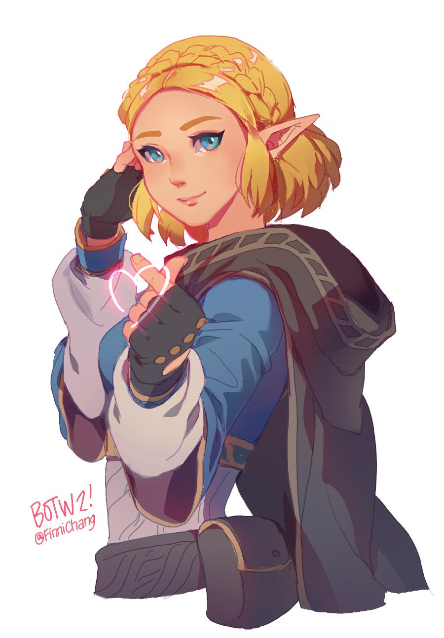 1girl adjusting_hair aqua_eyes belt belt_pouch black_cape black_gloves blonde_hair braid cape closed_mouth copyright_name crown_braid female_focus fingerless_gloves finni_chang forehead from_side gloves heart highres hood hood_down hooded_cape long_sleeves looking_at_viewer looking_to_the_side nintendo pointy_ears pouch princess_zelda short_hair simple_background smile solo the_legend_of_zelda the_legend_of_zelda:_breath_of_the_wild the_legend_of_zelda:_tears_of_the_kingdom twitter_username upper_body white_background