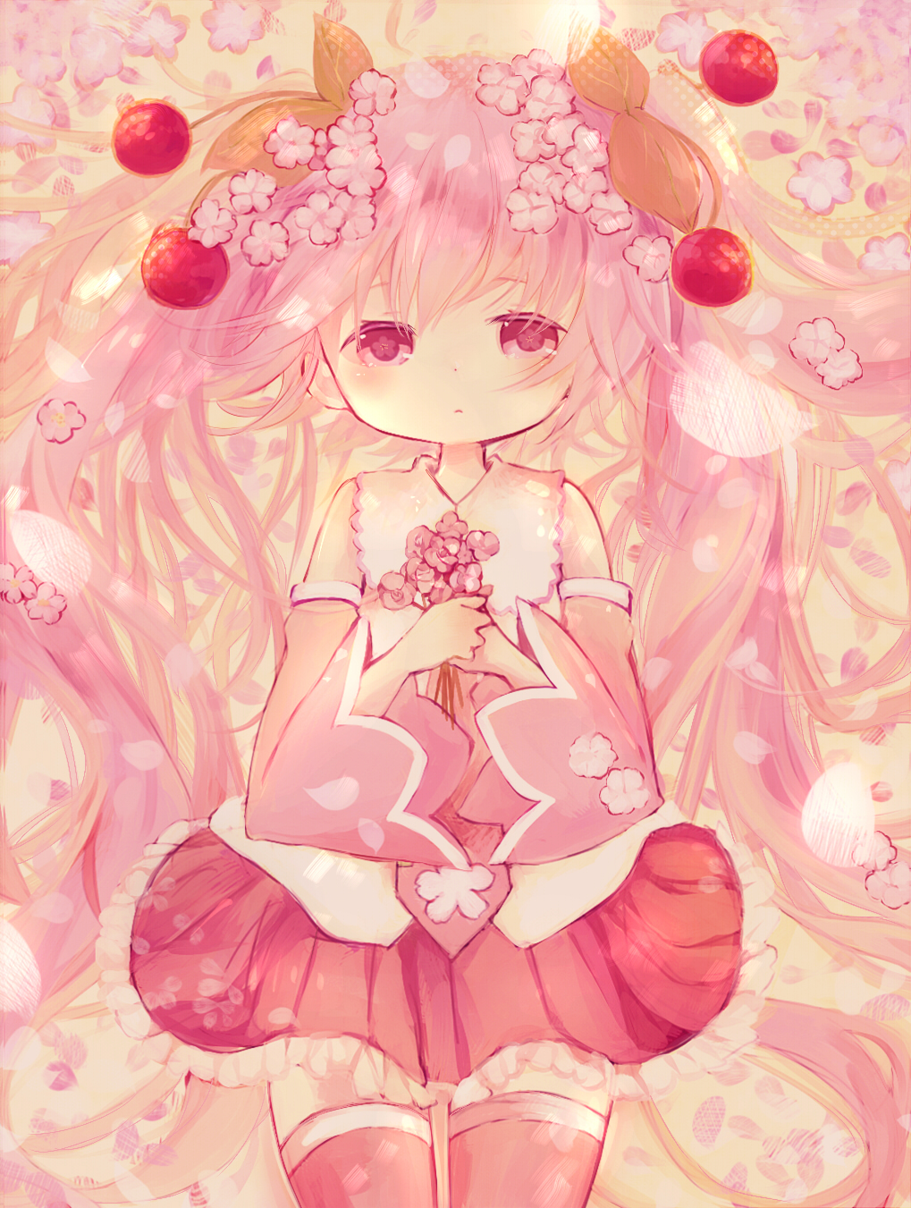 1girl bare_shoulders bouquet cherry cherry_blossoms cherry_hair_ornament chibi coco_(hinatacoco) commentary cowboy_shot detached_sleeves female_focus floral_print flower food food-themed_hair_ornament frilled_skirt frills fruit hair_flower hair_ornament hatsune_miku highres holding holding_bouquet leaf_hair_ornament long_hair looking_at_viewer necktie petals pink_eyes pink_hair pink_skirt pink_sleeves pink_theme sakura_miku shirt skirt sleeveless sleeveless_shirt solo untranslatable_commentary thighhighs twintails very_long_hair vocaloid zettai_ryouiki