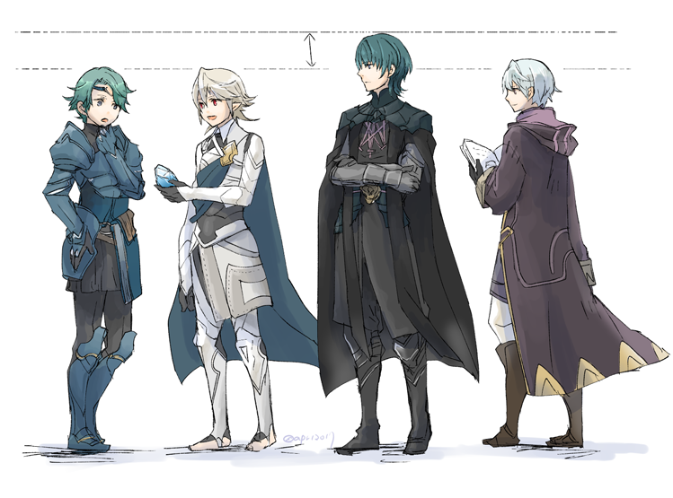 4boys alm_(fire_emblem) armor blue_eyes blue_hair cape male_corrin_(fire_emblem) fire_emblem fire_emblem:_three_houses fire_emblem_awakening fire_emblem_echoes:_shadows_of_valentia fire_emblem_fates gloves green_eyes green_hair hair_ornament hood male_byleth_(fire_emblem) male_focus male_robin_(fire_emblem) multiple_boys nintendo open_mouth pointy_ears red_eyes robaco short_hair simple_background smile white_background white_hair