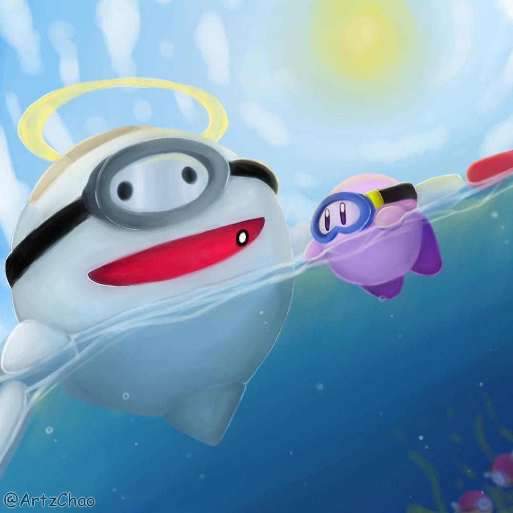 artzchao bandaid blipper blue_sky bubble cloud commentary day english_commentary fish floating goggles goggles_on_eyes goggles_on_head half-closed_eye halo kirby kirby_(series) nintendo no_humans one-eyed partially_underwater_shot red_eyes seaweed sideways_glance sky summer sun sunlight swimming tail twitter_username underwater water watermark wings zero_two_(kirby)