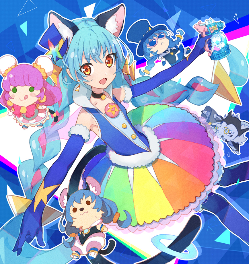 1boy 4girls :d :q abstract_background animal_ears bakenyan_(precure) black_neckwear blue_cat_(precure) blue_gloves blue_hair blue_headwear blue_legwear braid cat_ears cat_tail character_doll choker cowboy_shot cure_cosmo doll earrings elbow_gloves extra_ears furry gloves green_eyes hat holding jewelry long_hair looking_at_viewer magical_girl mao_(precure) mini_hat mini_top_hat multicolored_hair multicolored_skirt multiple_girls multiple_persona open_mouth orange_eyes outstretched_arms pantyhose pink_hair precure purple_hair shirt skirt sleeveless sleeveless_shirt smile spread_arms star_twinkle_precure tail tongue tongue_out top_hat twin_braids two-tone_hair urabe_(mstchan) yuni_(precure)