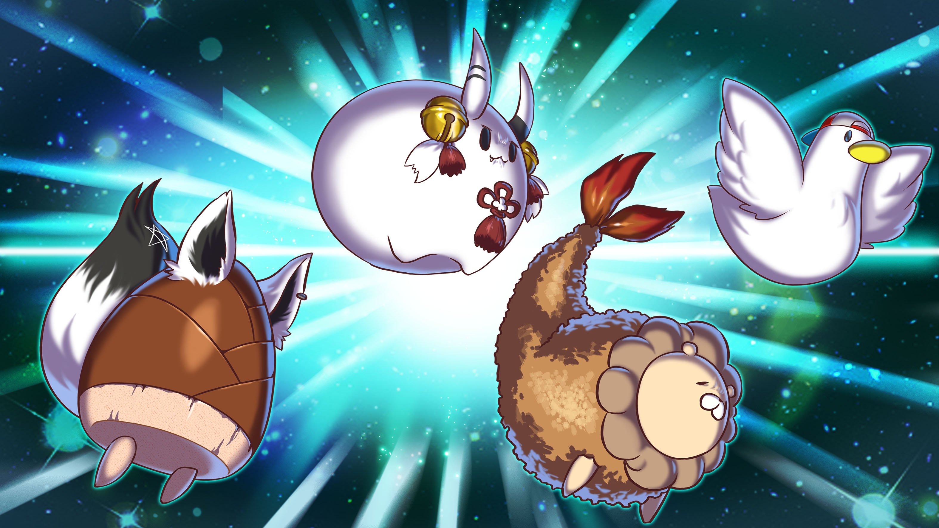 animal animal_ears backwards_hat bell bird chaki_(teasets) creature duck ebi_frion_(matsuri_channel) food fox_ears fox_tail hat highres hololive horns lion mascot nakiri_ayame natsuiro_matsuri no_humans oozora_subaru subaru_duck oruyanke_(shirakami_fubuki) poyoyo_(ayame_channel) shirakami_fubuki shrimp shrimp_tempura tail tempura virtual_youtuber