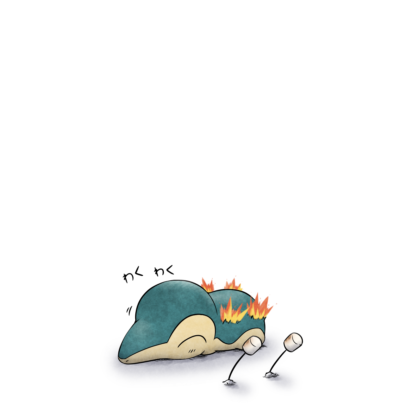 blush closed_eyes cyndaquil fire food full_body gen_2_pokemon highres japanese_text jpeg_artifacts kashiwa_(3920kashiwa) light_blush lying marshmallow mundane_utility nintendo no_humans on_stomach pokemon pokemon_(creature) pokemon_focus simple_background solo stick translation_request white_background