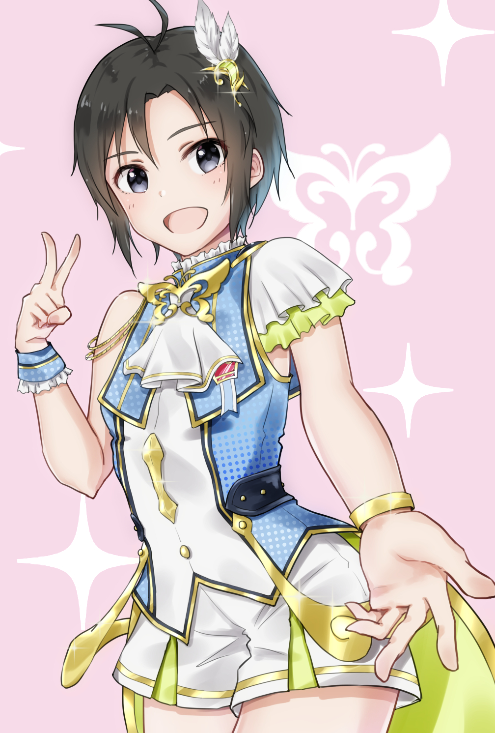 1girl :d antenna_hair asymmetrical_sleeves black_eyes black_hair bracelet cowboy_shot feather_hair_ornament feathers female_focus hair_between_eyes hair_ornament highres idolmaster idolmaster_(classic) idolmaster_million_live! idolmaster_million_live!_theater_days jewelry kikuchi_makoto looking_at_viewer lumiere_papillon_(idolmaster) mogskg open_mouth pink_background short_hair short_shorts shorts smile solo standing uneven_sleeves v white_feathers white_shorts wrist_cuffs