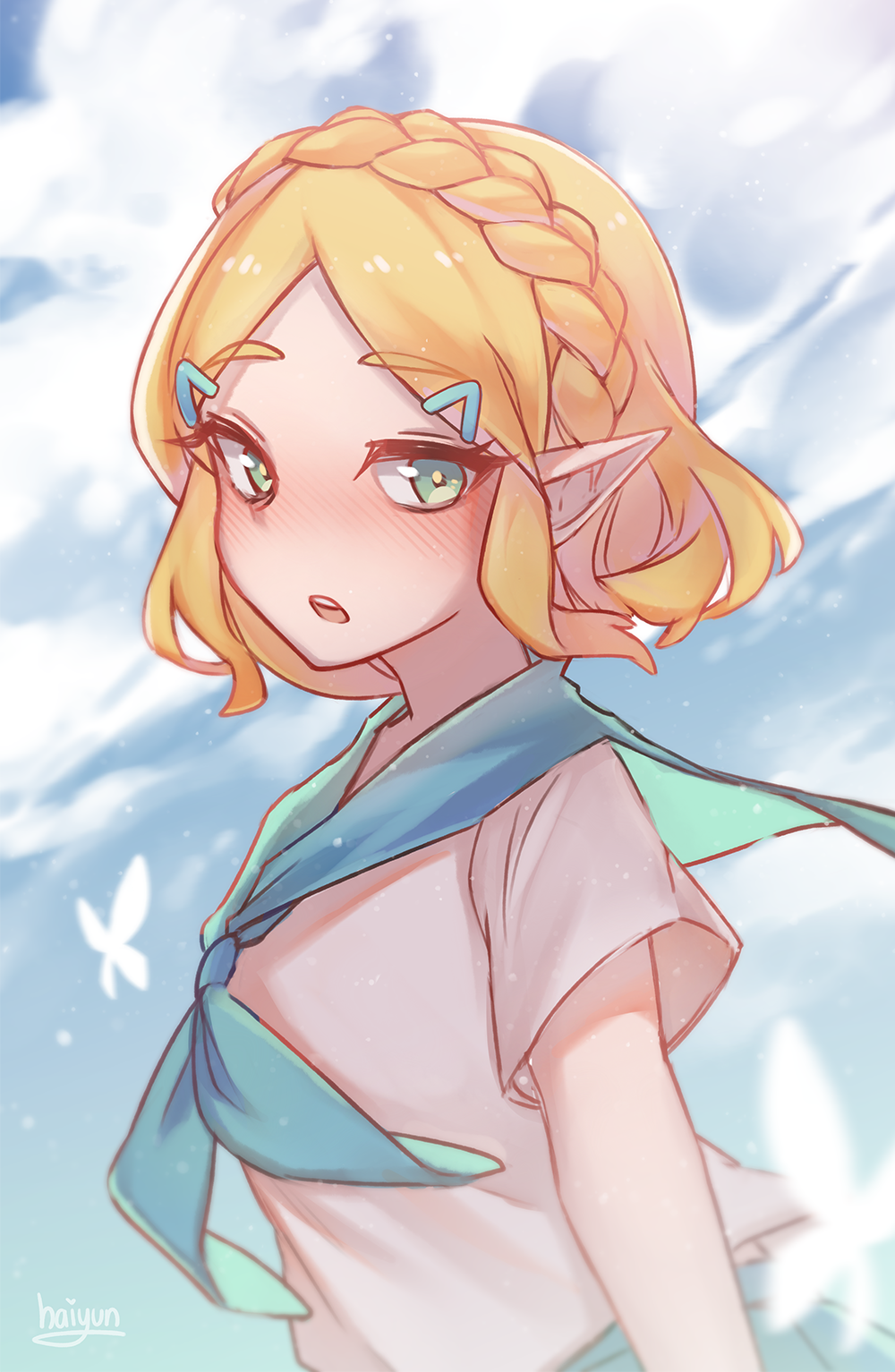 1girl :o alternate_costume aqua_eyes artist_name blonde_hair blue_neckerchief blue_sailor_collar blush braid bug butterfly cloud cloudy_sky crown_braid day female_focus from_side hair_ornament hairclip haiyun highres insect looking_at_viewer looking_to_the_side neckerchief nintendo nose_blush open_mouth outdoors parted_bangs pointy_ears princess_zelda sailor_collar school_uniform serafuku shirt short_hair short_sleeves sky solo the_legend_of_zelda the_legend_of_zelda:_breath_of_the_wild the_legend_of_zelda:_tears_of_the_kingdom upper_body white_shirt