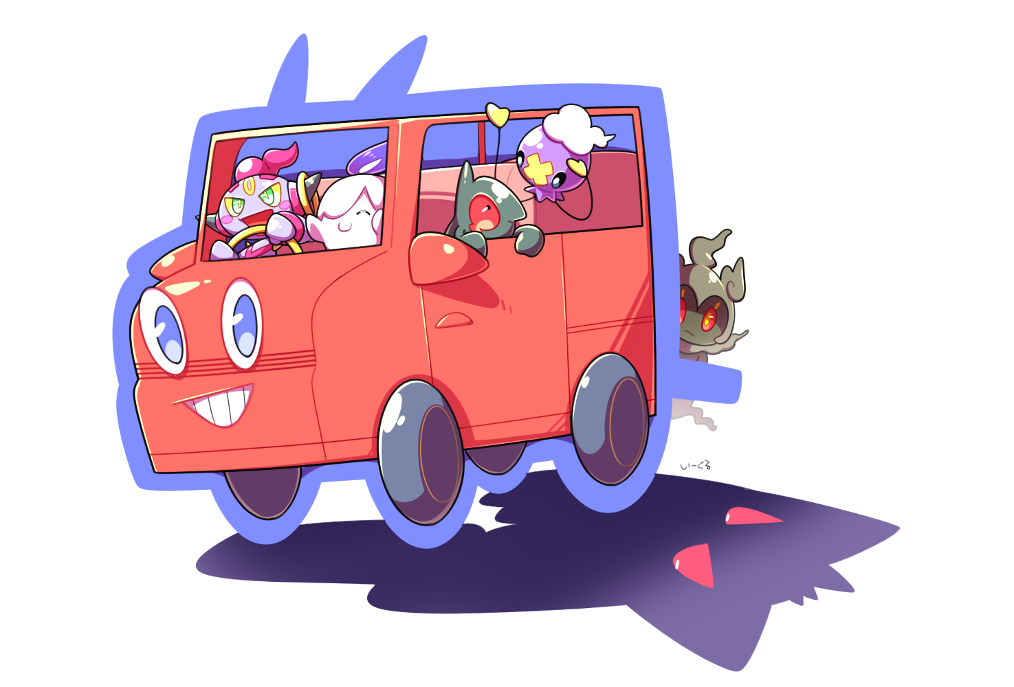 ^_^ black_eyes car closed_eyes commentary creature driving eagle_(pixiv8177028) floating gen_1_pokemon gen_4_pokemon gen_5_pokemon gen_6_pokemon gen_7_pokemon gengar ghost green_eyes grin happy hiding hiding_behind_another hoopa hoopa_(confined) legendary_pokemon litwick looking_at_viewer marshadow motor_vehicle mythical_pokemon nintendo no_humans pokemon pokemon_(creature) red_eyes rotom rotom_(other) shadow signature simple_background smile steering_wheel translated vehicle_focus white_background yamask