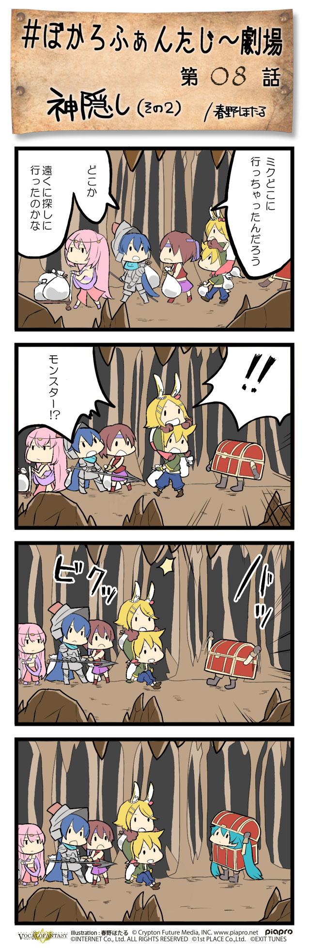 ! !! !? 2boys 4girls 4koma animal_ears aqua_hair armor arms_up blonde_hair blue_hair brown_hair cape carrying cart cave chibi comic commentary dancer fantasy harunohotaru hatsune_miku headband highres hood hooded_jacket jacket kagamine_len kagamine_rin kaito_(vocaloid) megurine_luka meiko_(vocaloid) multiple_boys multiple_girls piggyback pink_hair polearm sack spear stalactite translated treasure_chest twintails vocaloid weapon