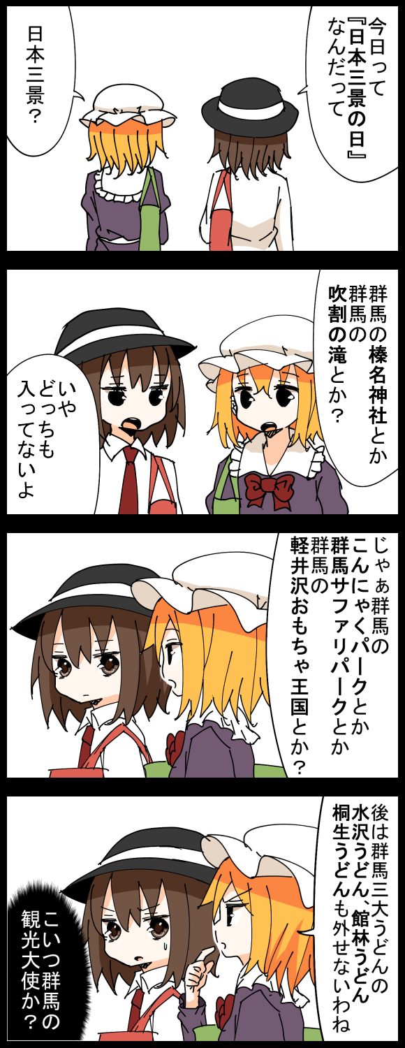4koma bag blonde_hair brown_hair comic dress hat highres jetto_komusou maribel_hearn mob_cap necktie purple_dress shirt shoulder_bag touhou translated usami_renko white_shirt