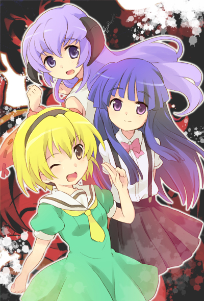 00s 3girls blonde_hair blue_eyes blue_hair bow dress furude_rika green_skirt hanyuu higurashi_no_naku_koro_ni houjou_satoko index_finger_raised multiple_girls one_eye_closed pink_bow purple_eyes purple_hair sailor_dress school_uniform skirt suspender_skirt suspenders tachitsu_teto wink