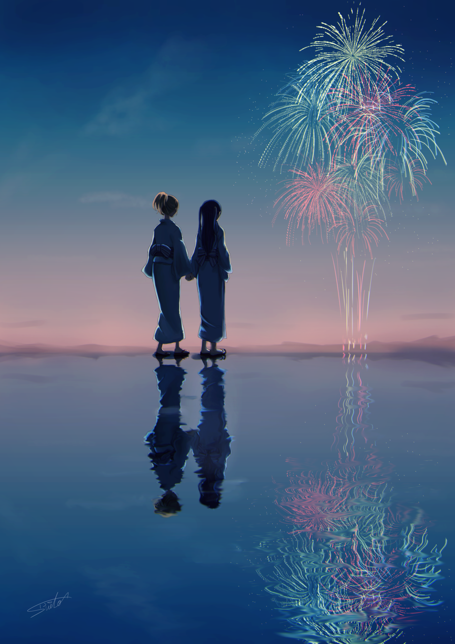2girls ayase_eli blonde_hair blue_hair commentary_request fireworks from_behind full_body highres holding_hands japanese_clothes kimono long_hair love_live! love_live!_school_idol_project mountainous_horizon multiple_girls night outdoors reflection reflective_liquid sky sonoda_umi standing suito twintails water yukata yuri