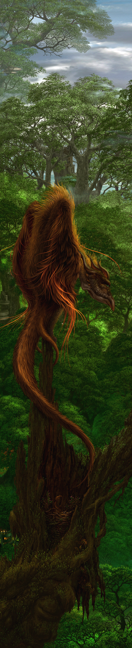 bad_id bad_pixiv_id bird cloud creature fantasy forest highres kazumasa_uchio long_image nature no_humans original scenery tail tall_image tree treehouse uchio_kazumasa
