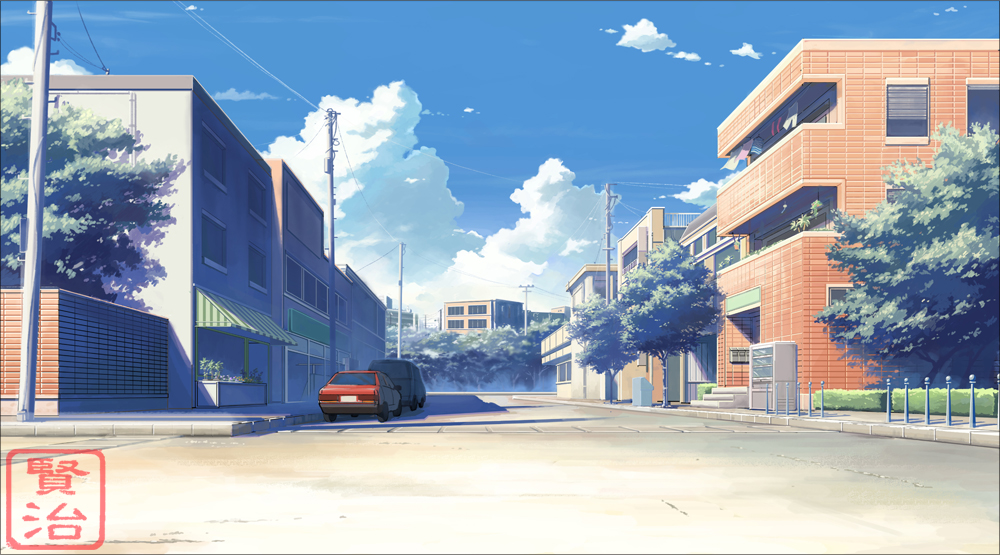 awning blue_sky building car cloud commentary day kenji_gonzales motor_vehicle no_humans original outdoors power_lines road scenery sidewalk signature sky street tree utility_pole vanishing_point