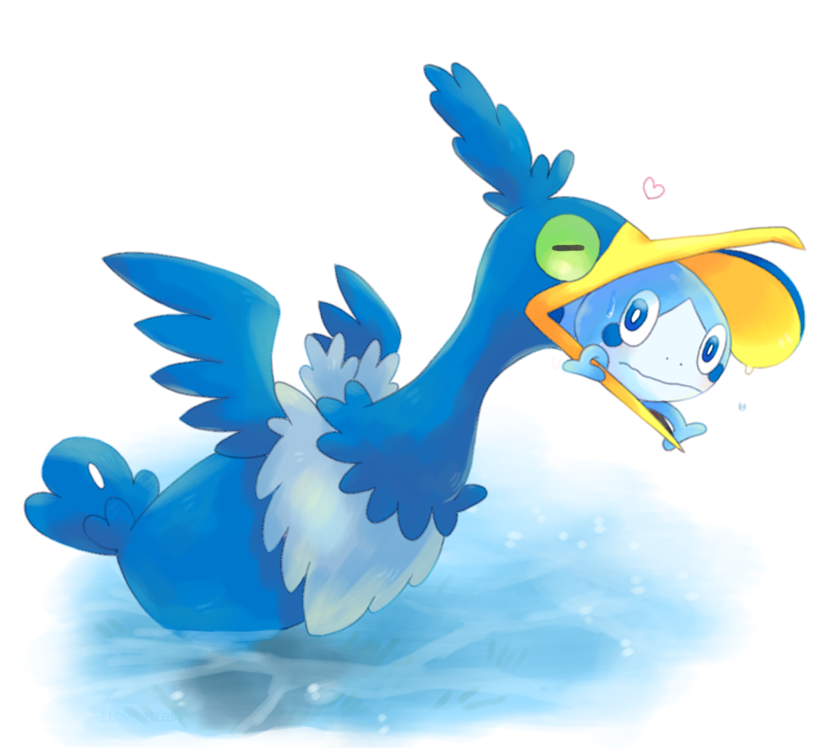 animal_focus bird black_eyes blue_eyes colored_sclera cramorant full_body gen_8_pokemon green_sclera happi_xfyg heart in_mouth nintendo no_humans open_mouth pokemon pokemon_(creature) pokemon_swsh simple_background sobble standing vore water white_background