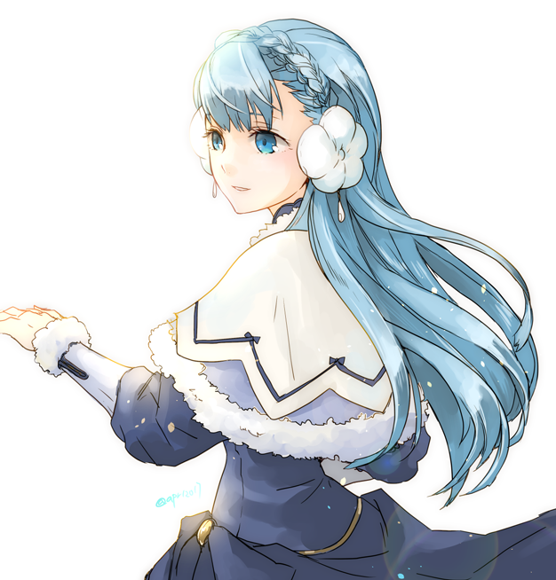 1girl blue_eyes blue_hair braid crown_braid female_focus fire_emblem fire_emblem_echoes:_shadows_of_valentia fire_emblem_heroes fur_trim long_hair long_sleeves nintendo parted_lips rinea_(fire_emblem) rinea_(soiree)_(fire_emblem) robaco simple_background solo twitter_username upper_body white_background
