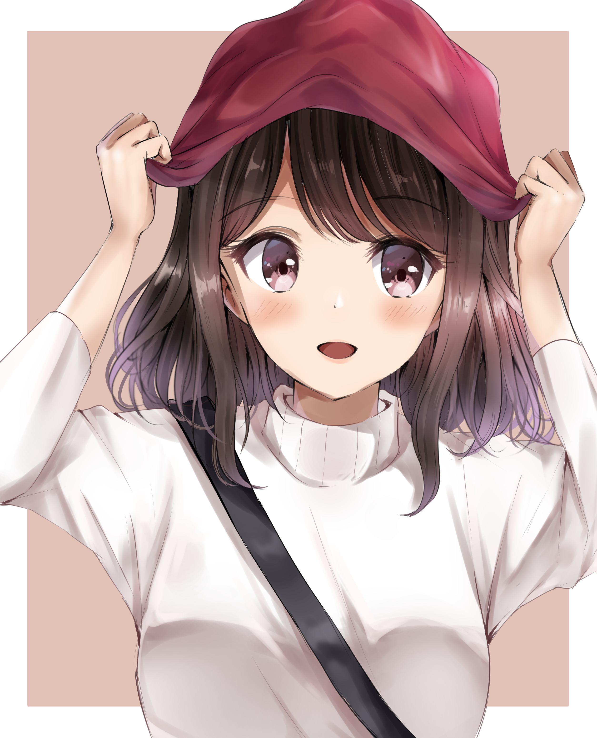 1girl :d absurdres arms_up beanie blush breasts brown_background brown_eyes brown_hair commentary_request female_focus hat highres long_sleeves looking_at_viewer open_mouth original red_hat shirt sin_(sin52y) small_breasts smile solo two-tone_background upper_body white_background white_shirt
