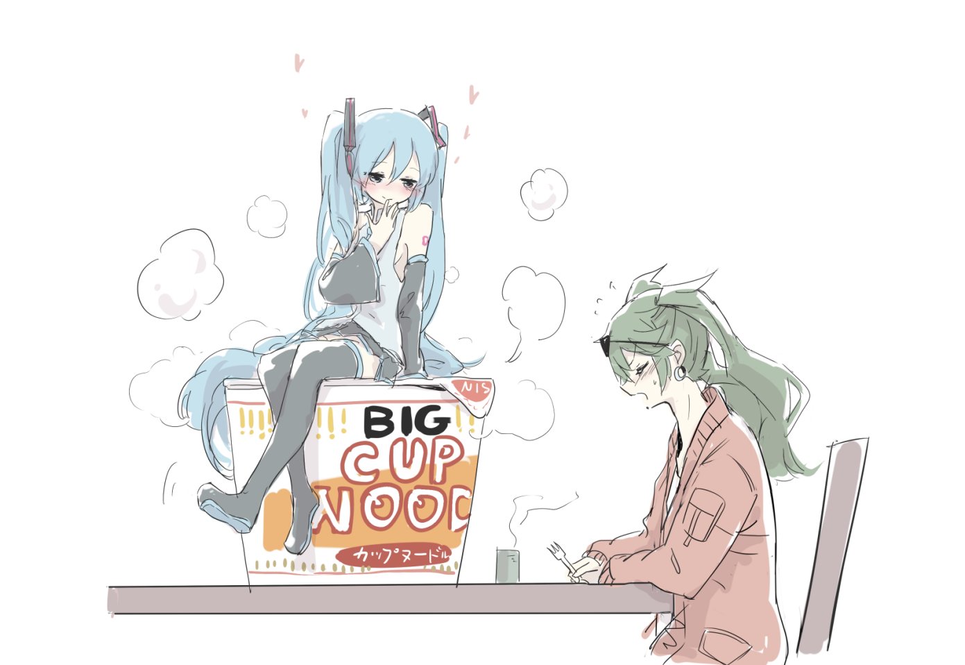 2girls aqua_eyes aqua_hair aqua_necktie arm_support bare_shoulders black_legwear black_skirt black_sleeves blush chair commentary cup detached_sleeves dual_persona earrings eyewear_on_head finger_to_mouth fork green_hair grey_shirt hair_ornament hatsune_miku hatsune_miku_(noodle_stopper) heart holding holding_fork instant_noodles jacket jewelry long_hair looking_at_another multiple_girls necktie nejikyuu nissin nissin_cup_noodle open_mouth oversized_food oversized_object red_jacket shirt shoulder_tattoo sitting sketch skirt sleeveless sleeveless_shirt smile steam suna_no_wakusei_(vocaloid) sunglasses sweatdrop swinging_legs table tattoo tea teacup thighhighs twintails v-shaped_eyebrows very_long_hair vocaloid white_shirt zettai_ryouiki