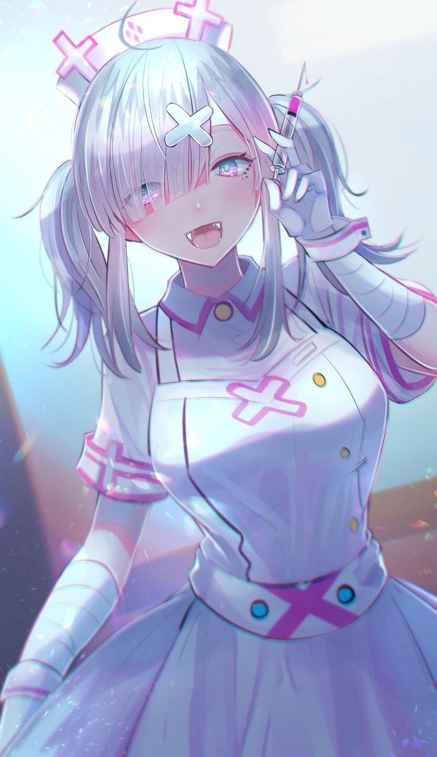 1girl ahoge apron bad_id bad_twitter_id blush breasts chromatic_aberration commentary cowboy_shot dress eyes_visible_through_hair female_focus gloves hair_ornament hair_over_one_eye hat highres large_breasts long_hair looking_at_viewer mole mole_under_eye nijisanji nurse nurse_cap open_mouth purple_eyes seia_(tikxxx) sharp_teeth short_sleeves silver_hair smile solo sukoya_kana teeth twintails virtual_youtuber white_apron white_dress white_gloves white_hat wrist_cuffs x_hair_ornament