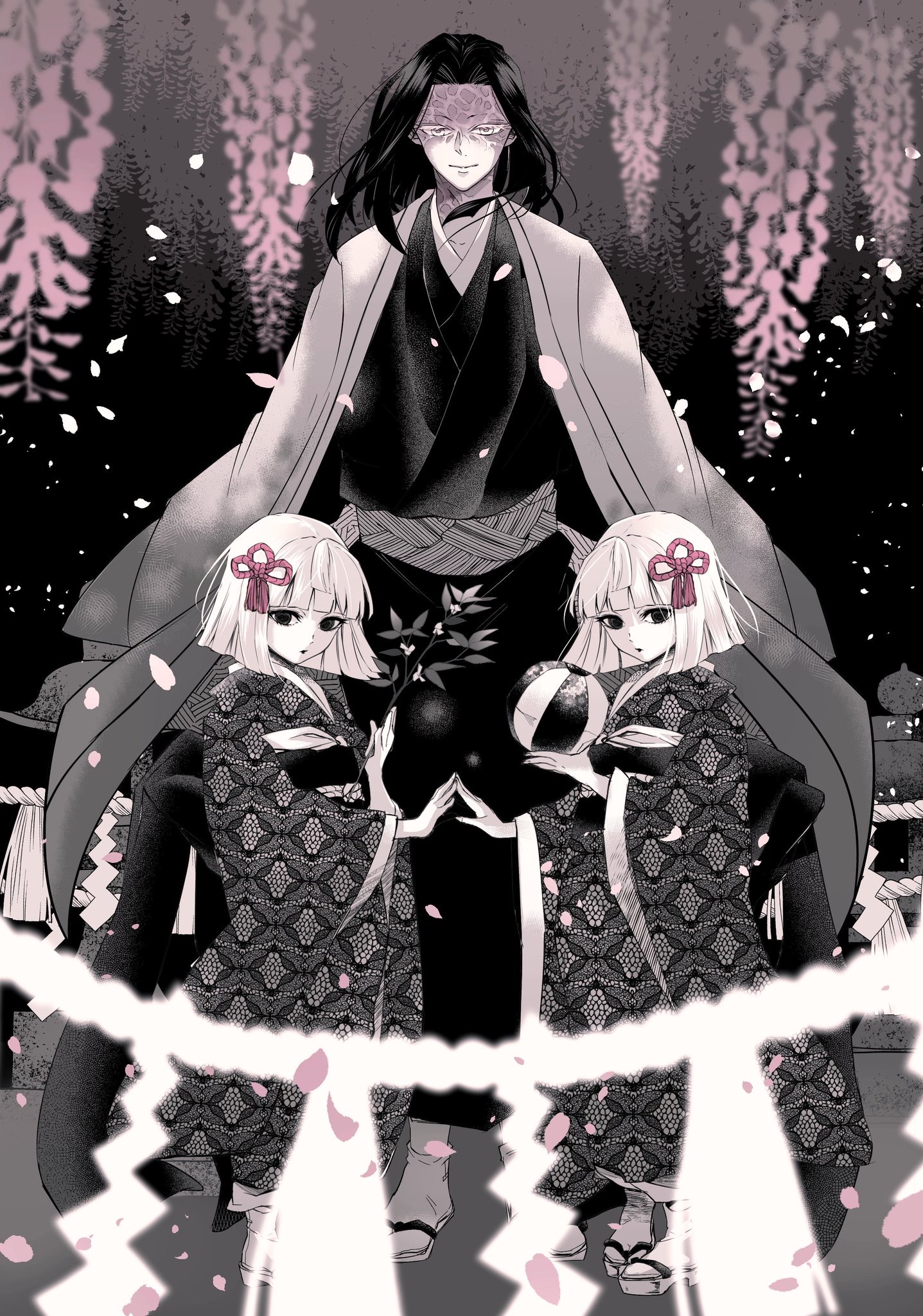 1boy 2girls ball blurry bob_cut branch burn_scar child closed_mouth depth_of_field father_and_child father_and_daughter finger_touching flower geta hair_ribbon haori highres holding holding_ball holding_branch hydrangea japanese_clothes kimetsu_no_yaiba kimono looking_at_viewer morita_yuu multiple_girls obi parent_and_child petals pigeon-toed ribbon rope sash scar scar_on_face shide shimenawa short_hair siblings sisters smile spot_color standing stone_lantern symmetrical_pose tabi temari_ball twins ubuyashiki_hinaki ubuyashiki_kagaya ubuyashiki_nichika unmoving_pattern