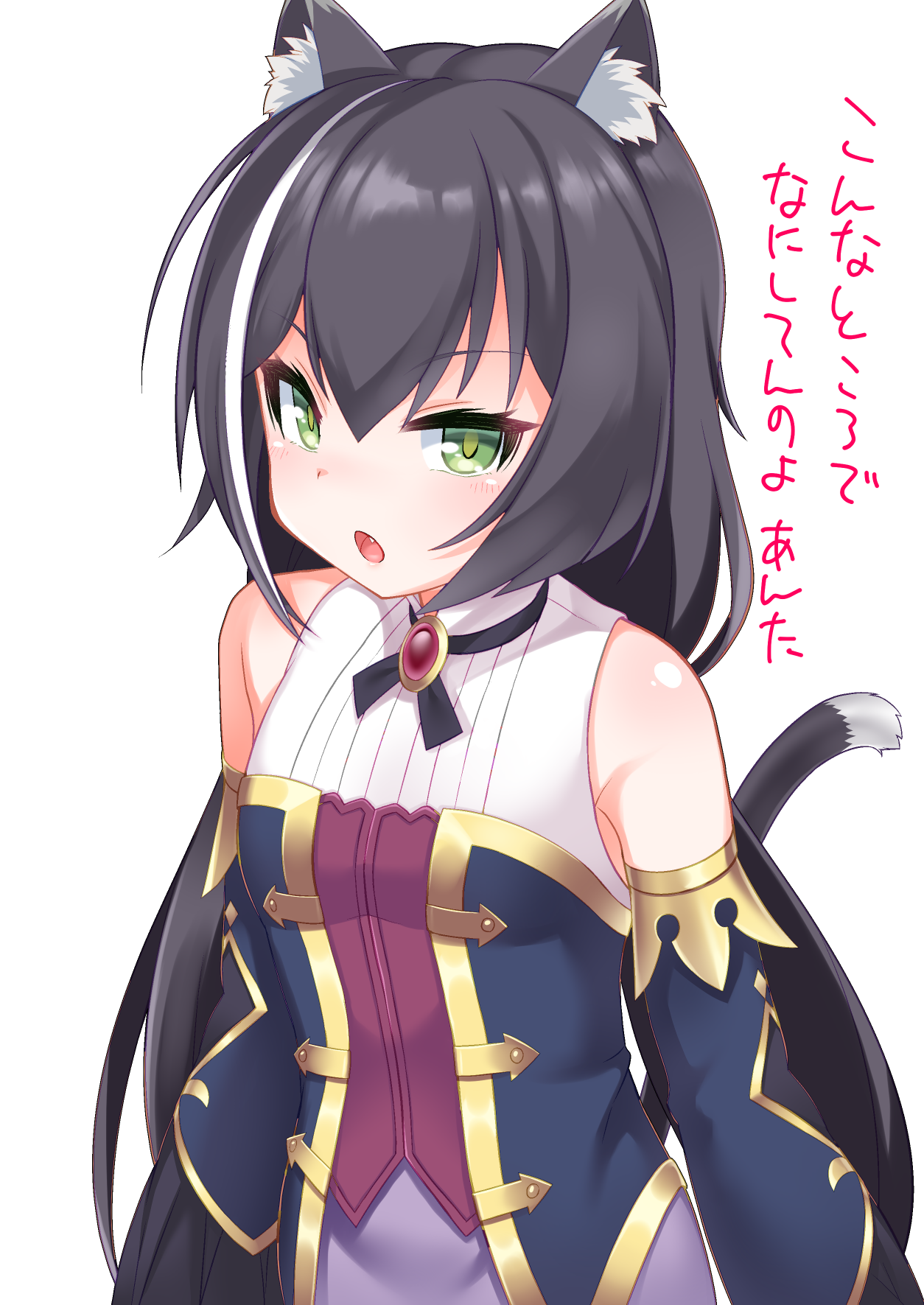 1girl animal_ear_fluff animal_ears bare_shoulders black_hair blue_sleeves blush breasts cat_ears cat_girl cat_tail commentary_request detached_sleeves fang female_focus green_eyes hair_between_eyes highres karyl_(princess_connect!) kirisame_mia long_hair long_sleeves looking_at_viewer multicolored_hair open_mouth princess_connect! purple_skirt shirt simple_background skirt sleeveless sleeveless_shirt small_breasts solo streaked_hair tail tail_raised translation_request very_long_hair white_background white_hair white_shirt