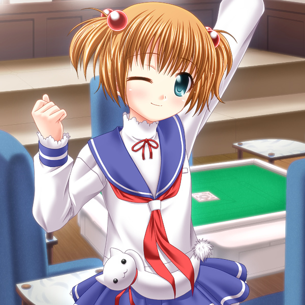 00s 1girl aqua_eyes arm_up brown_hair child female_focus hair_bobbles hair_ornament kataoka_yuuki one_eye_closed saki_(manga) school_uniform serafuku short_twintails solo twintails two_side_up wink yaoyorozu-kobo