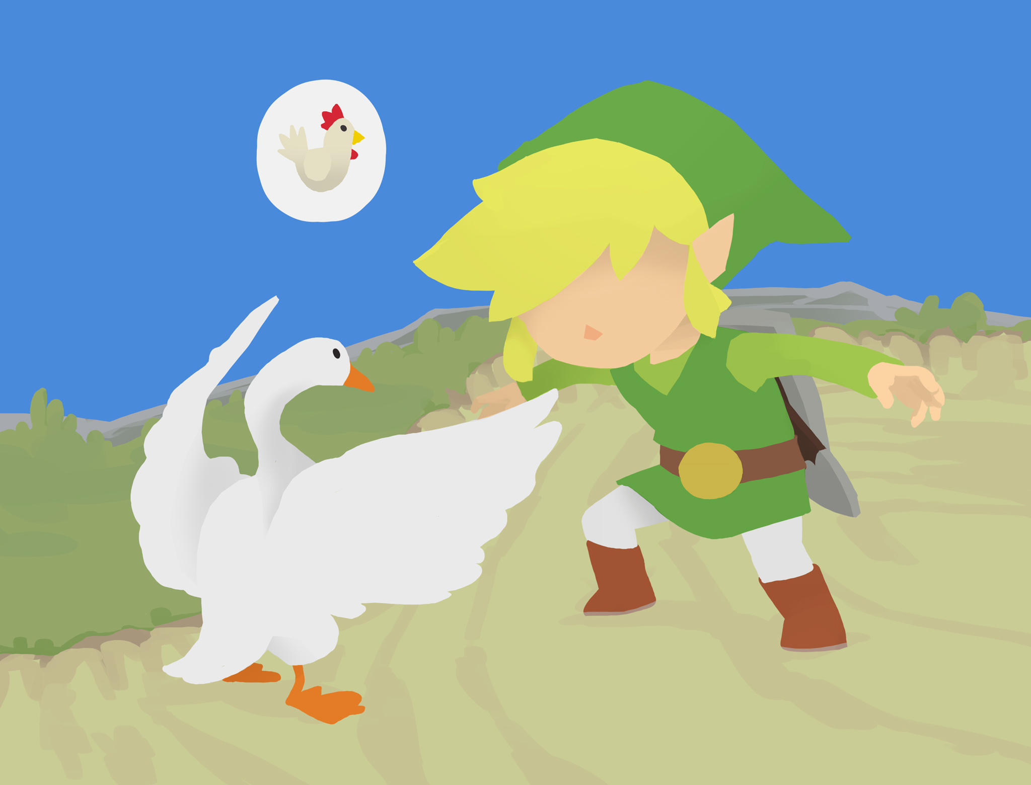 1boy arms_up belt bird black_eyes blonde_hair blue_sky brown_footwear chicken crossover day faceless faceless_male from_behind goose goose_(untitled_goose_game) grass green_headwear green_shirt hat highres leggings link long_sleeves male_focus minimalism niko_geyer nintendo outdoors pointy_ears shield shield_on_back shirt shoes short_hair sky sword the_legend_of_zelda the_legend_of_zelda:_the_wind_waker toon_link tunic untitled_goose_game weapon white_legwear