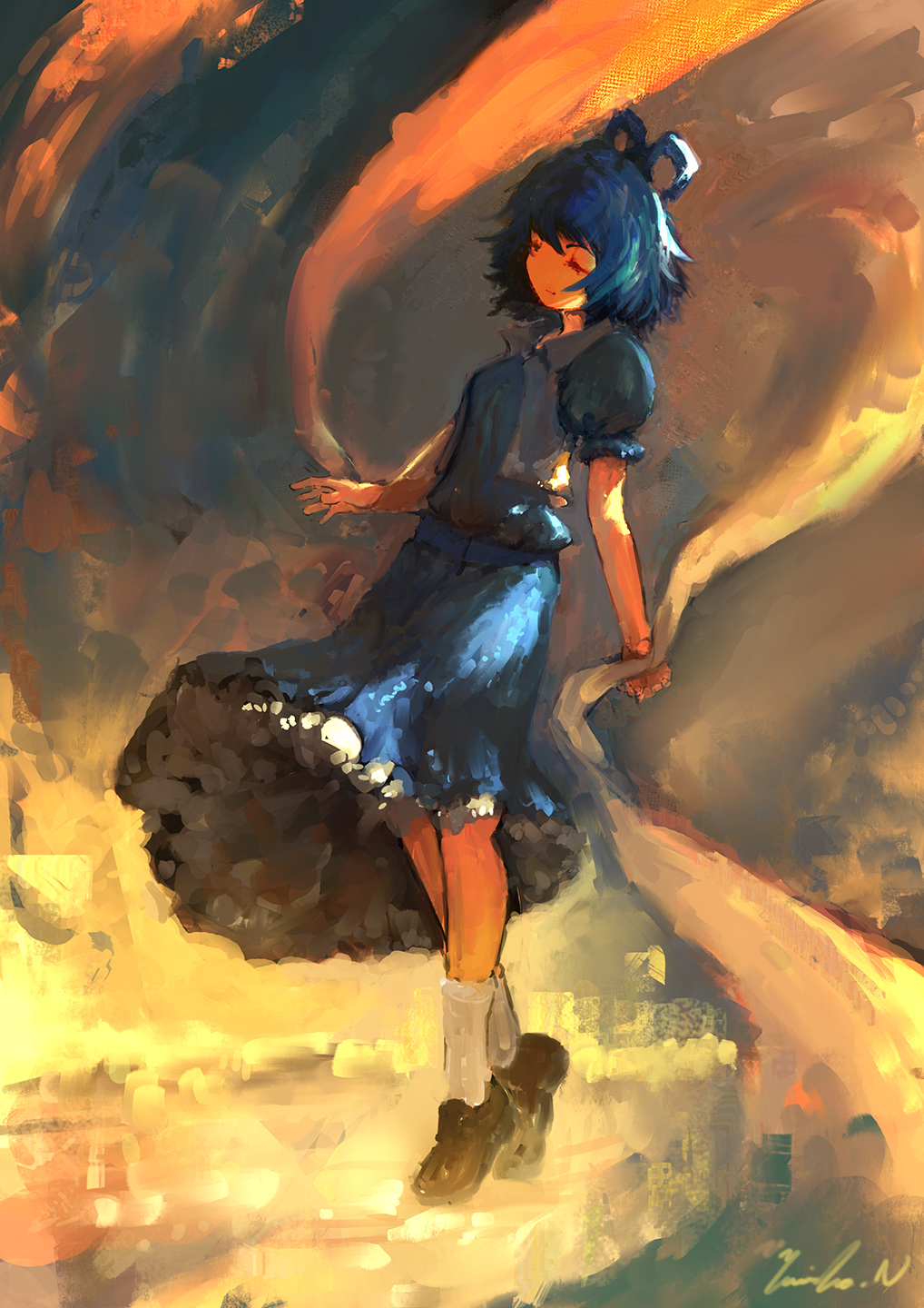 1girl artist_name bad_id bad_pixiv_id blue_dress blue_hair closed_eyes collared_dress dress faux_traditional_media female_focus full_body hair_between_eyes hair_rings highres kaku_seiga loafers matsura_ichirou shawl shoes short_hair short_sleeves socks solo touhou white_socks