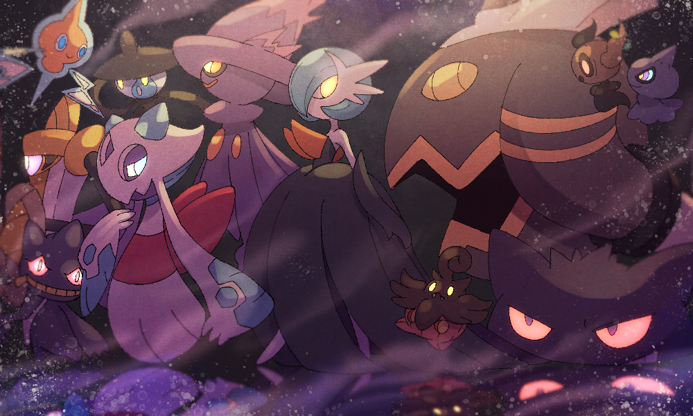 1girl aegislash alternate_color back_bow banette black_sclera blank_eyes blue_eyes blue_hair bow closed_mouth colored_sclera colored_skin crystal dusknoir fangs floating froslass gardevoir gen_1_pokemon gen_3_pokemon gen_4_pokemon gen_5_pokemon gen_6_pokemon gengar ghost glowing glowing_eyes grin hair_over_one_eye hand_up happy lampent looking_at_another looking_to_the_side mega_gardevoir mega_pokemon mismagius nintendo orange_eyes phantump pokemon pokemon_(creature) pumpkaboo purple_eyes red_bow red_sclera reflection rotom rotom_(normal) sash shiny_pokemon short_hair shuppet smile standing teeth white_skin yellow_sclera yukifuri_tsuyu