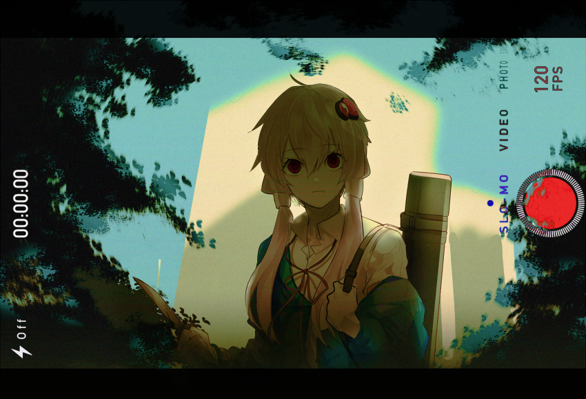1girl backlighting blue_sky blurry blurry_background building commentary document_tube empty_eyes expressionless fake_phone_screenshot fake_screenshot female_focus hair_ornament holding holding_knife holding_strap jacket knife leaf letterboxed outdoors purple_eyes purple_hair recording short_hair short_hair_with_long_locks sky solo untranslatable_commentary timestamp tree upper_body v_cho3 vocaloid voiceroid yuzuki_yukari