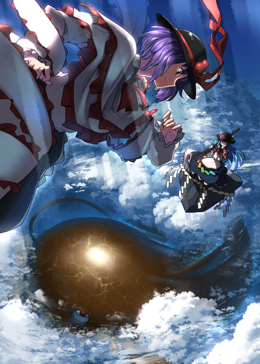 2girls :t apron black_headwear blue_hair carillus catfish cloud commentary day eating fish flying food frills fruit hat hat_ribbon highres hinanawi_tenshi holding holding_food kaname-ishi light_rays long_hair multiple_girls nagae_iku namazu_(touhou) peach purple_hair red_eyes red_ribbon ribbon rope shide shimenawa shirt short_hair sitting sky sunbeam sunlight sword_of_hisou touhou white_shirt