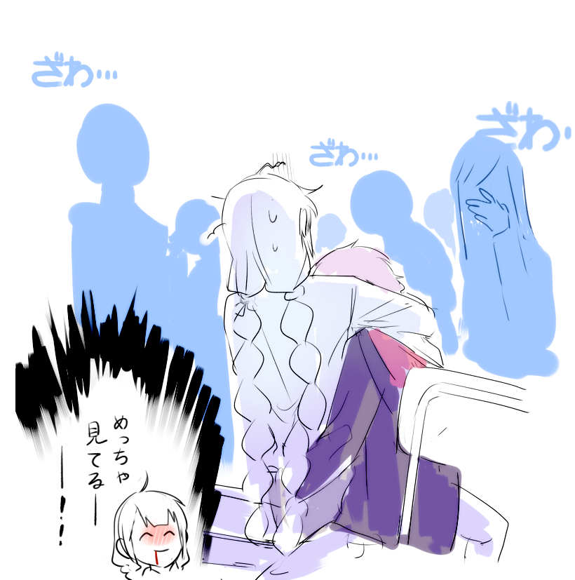 2girls ^_^ blood blood_from_mouth blush braid chair closed_eyes covering_own_mouth crowd embarrassed from_behind hood hooded_jacket jacket kizuna_akari multiple_girls omake purple_hair purple_jacket silhouette sitting sitting_on_lap sitting_on_person smile sweat sweatdrop translated twin_braids v_cho3 voiceroid white_hair yuzuki_yukari